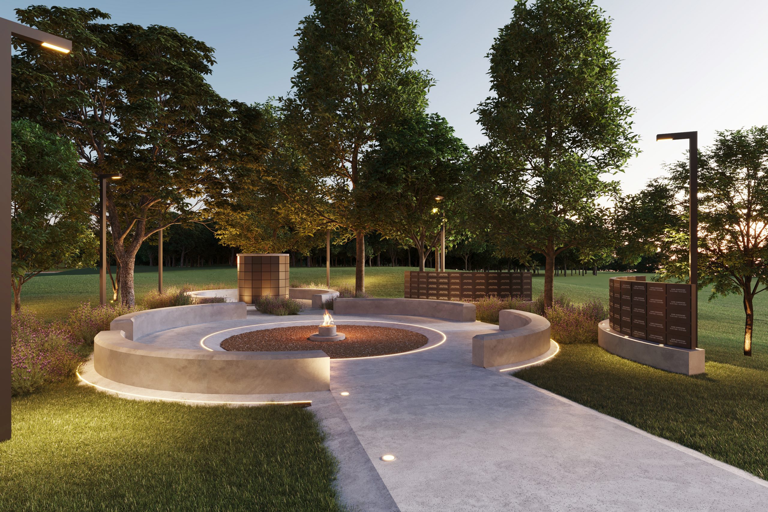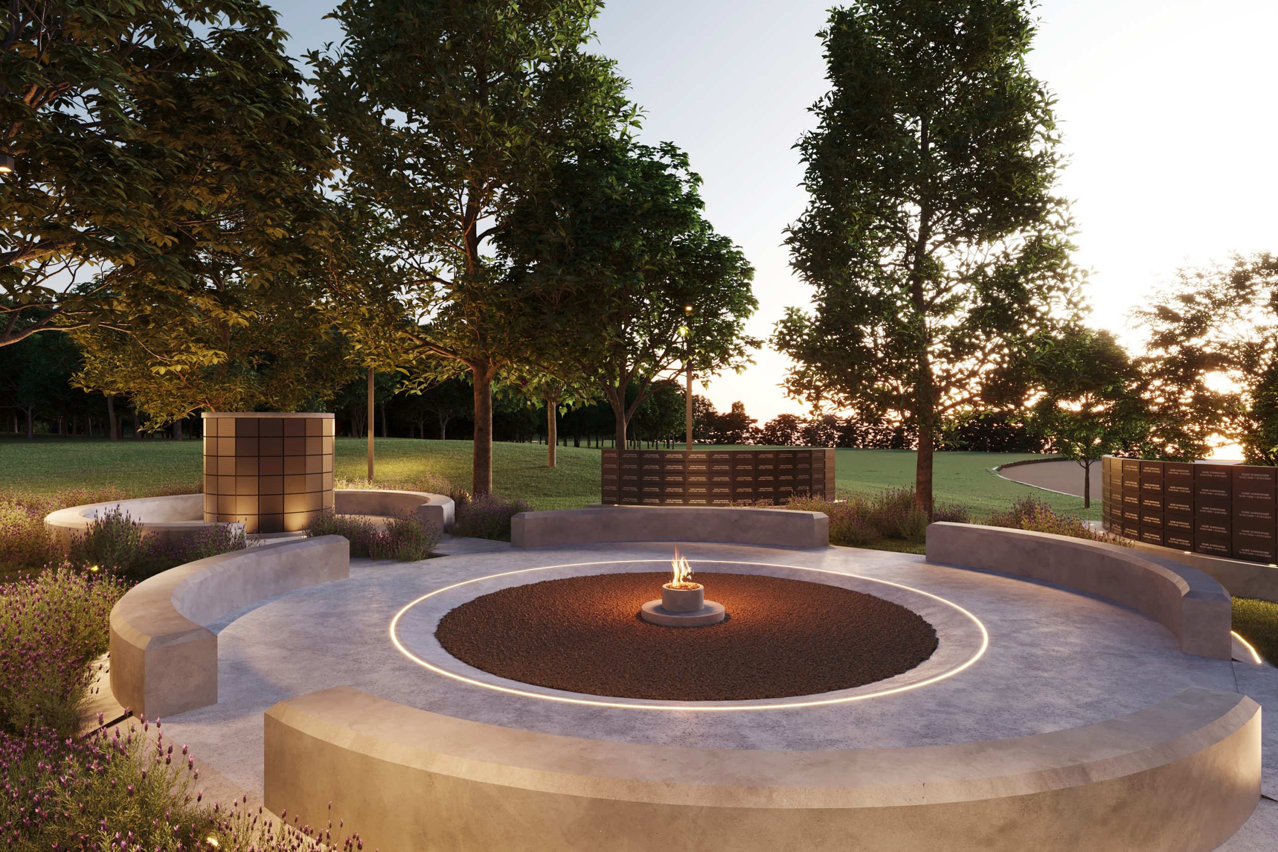 O design inovador conta com dois núcleos circulares: um para cerimônias de despedida, destacando uma chama infinita que simboliza memórias eternas, e outro para abrigar urnas com cinzas, garantindo um local de respeito e sensibilidade para quem partiu.