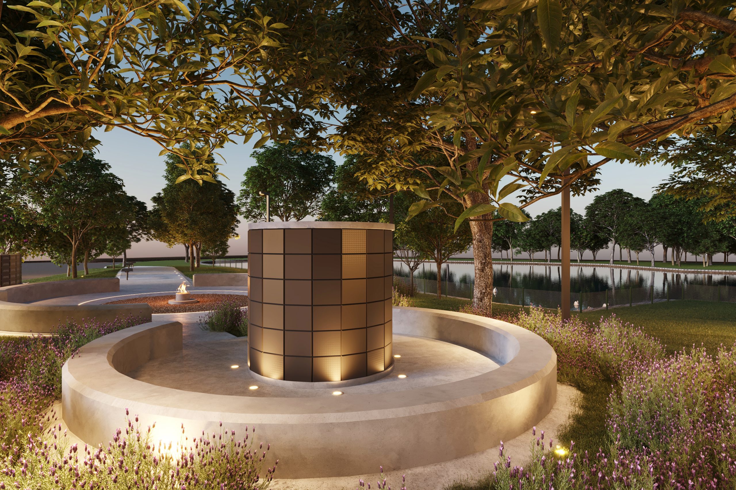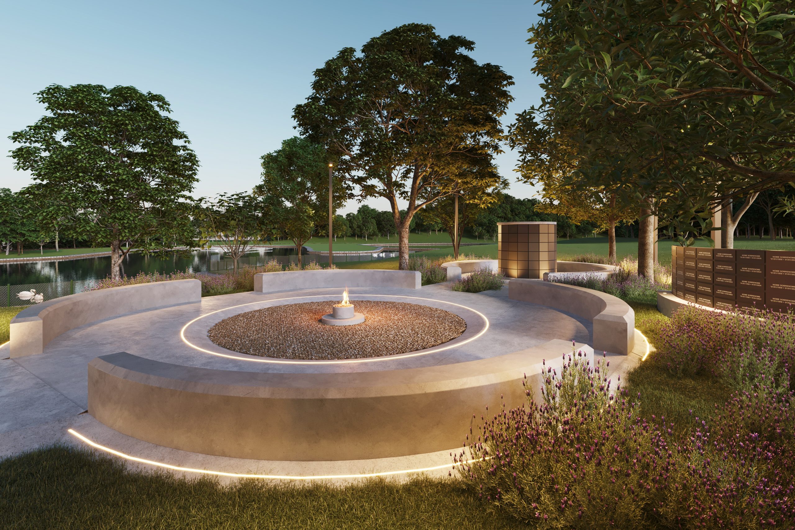 Projetado para transformar despedidas em memórias, o cinerário possui um ambiente sereno e contemplativo. Localizado em meio à natureza, com jardins de lavanda e vista para um lago, o espaço combina modernidade e acolhimento.